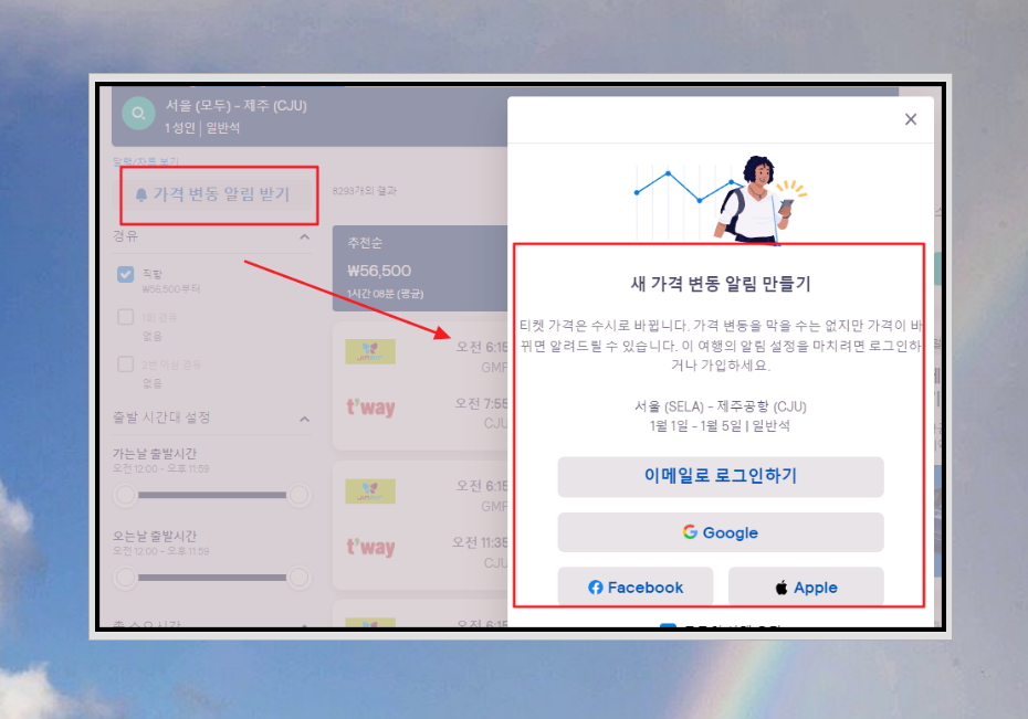 8. 항공권을 찾을 때마다 싸게 나온 티켓의 가격이 달라질 수 있습니다. 수시로 수요와 공급에 따라 비행기 티켓 가격이 변하기 때문인데요. 이럴 때에는 "가격 변동 알림 받기" 방법을 사용해 보세요. 싸게 나온 항공권이 나타나면 스카이스캐너로부터 알림을 받을 수 있습니다. 알림 받은 즉시 티켓을 구입하는 방법을 시도해 볼 수 있어요.