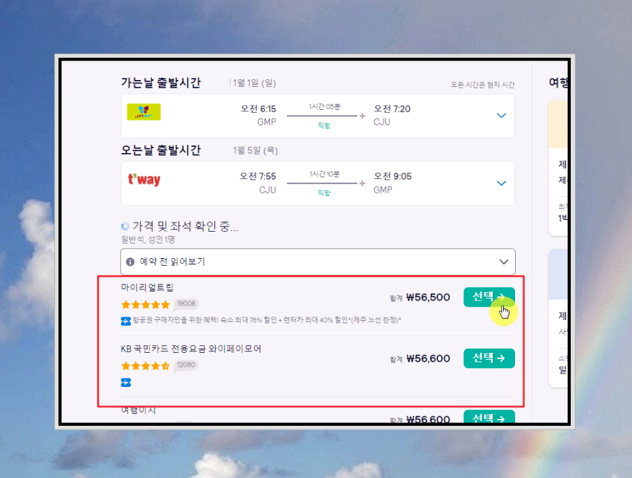 1. 제가 찾아본 바에 의하면 1월 초에 제주를 갔다가 돌아오는 왕복 티켓을 싸게 구입하는 경우 56,500원 밖에 들지 않았습니다. 네이버 페이 적립을 적용하면 1% 추가 할인이 되기 때문에 약간 더 저렴하게 예약이 가능하죠. 비행기 탑승 시각이 아침 일찍이라는 단점이 있지만, 최저가 티켓을 이용하면 이정도까지 티켓 요금을 낮출 수 있다는 것을 알 수 있었습니다.