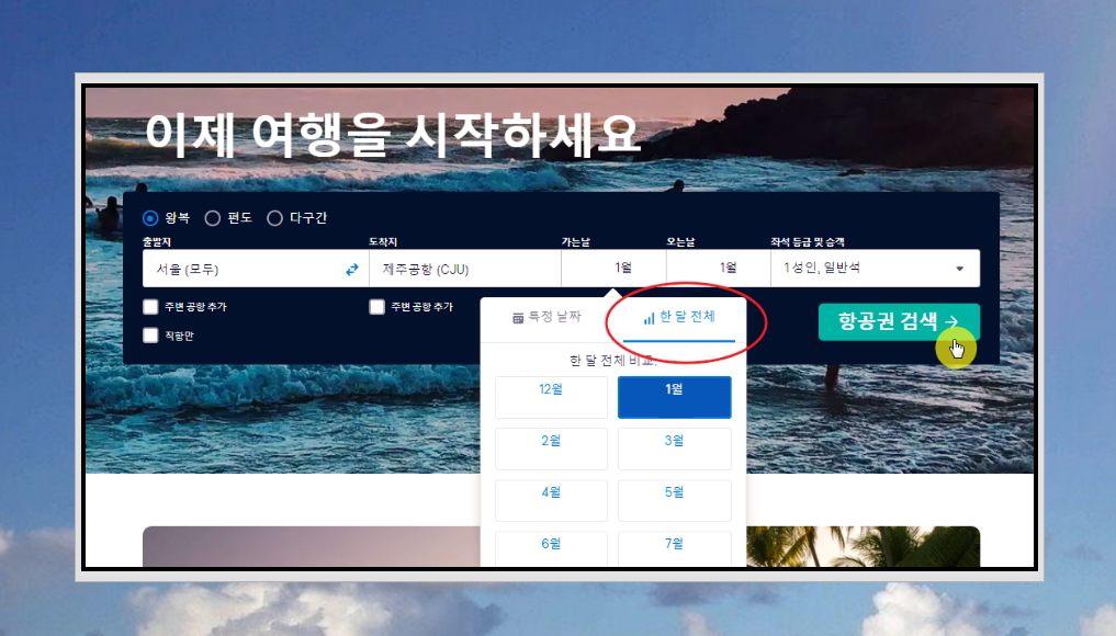 4. 스카이스캐너 홈페이지에 접속하면 본인의 여행 계획에 맞춰 몇 가지 정보를 입력해 주세요. 저는 제주도를 가는 비행기표 중에서 싸게 나온 것을 구입하는 방법을 진행해 보겠습니다. 여기서 주목해야 할 부분이 있습니다. 날짜를 지정할 때에는 한 달 단위로 선택해 주세요. 이렇게 해야 항공권을 싸게 구입할 수 있는 날짜를 찾을 수 있습니다. 여행 날짜를 조율하기 어려운 경우에는 어쩔 수 없지요.