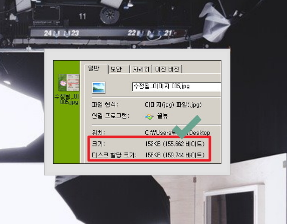 위와 같은 옵션으로 지정하고 확인을 누르니 152KB가 되었네요.^^