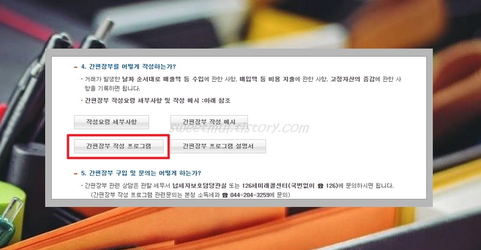 그럼 아래와 같이 메뉴검색 2건이 나오는데요. 간편장부안내를 누르시면 관리 프로그램을 다운받을 수 있는 곳이 나온답니다.