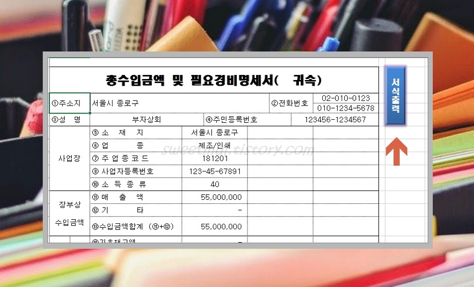위와 같이 총수입금액 및 필요경비명세서에 정리된 내용들이 쫘르륵 나온답니다. 기본정보를 변경하지 않으시면 위와 같이 '부자상회'로 나오니까 신고서식을 이용하시려면 기본정보를 꼭 입력해주셔야 합니다.