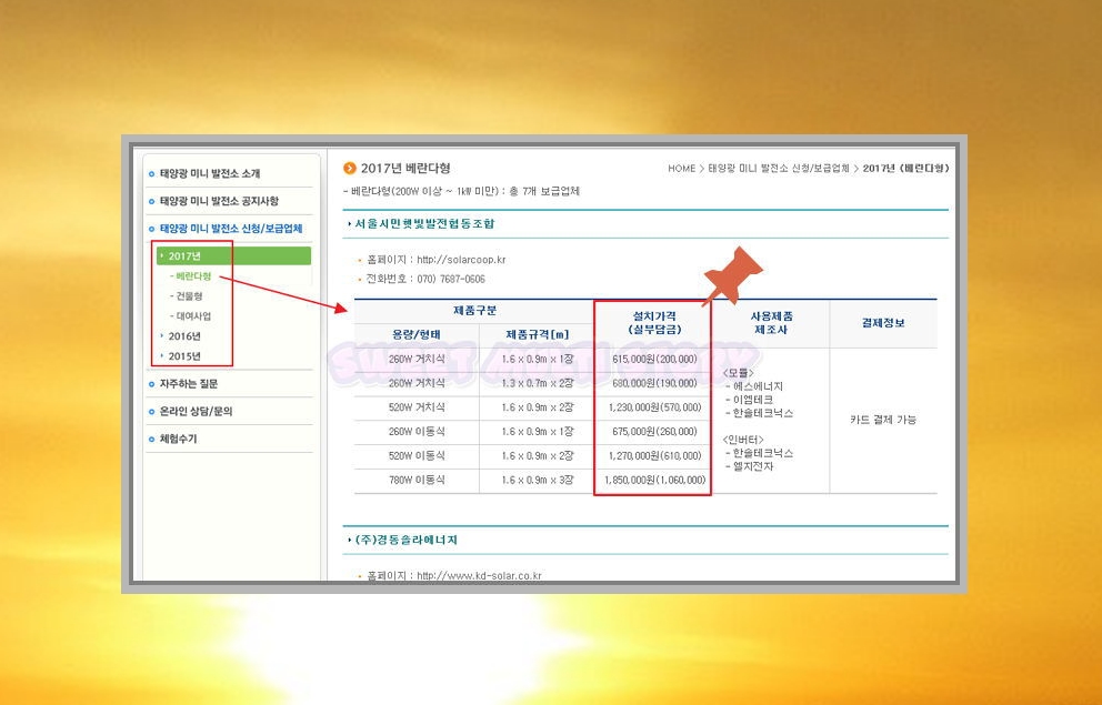 대부분의 미니 태양광은 햇빛이 잘 들어오는 베란다에 붙입니다. 그래서 많은 분이 베란다형 태양광을 이용하시는데요. 위와 같이 다양한 업체의 설치비용을 확인하실 수 있습니다. 사용하는 모듈과 인버터의 제조사도 나와 있고, 용량과 형태 그리고 제품규격에 따른 비용도 각각 확인하실 수 있어요.