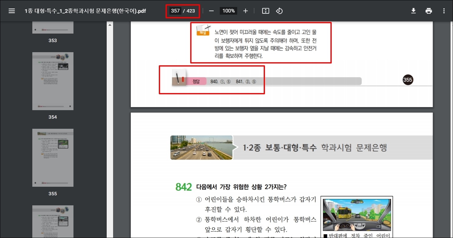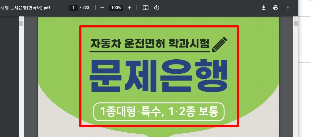 총 423페이지의 PDF 파일을 통해 1000개의 문항으로 구성된 문제은행 자료를 풀어볼 수 있어요. 운전면허 필기시험의 경우 여기에서 몇 가지 문제가 선정되어 출제가 되기 때문에 시험에 나올 예상문제가 맞아요. 독학을 할 때 해당 자료만 풀어도 충분해요.