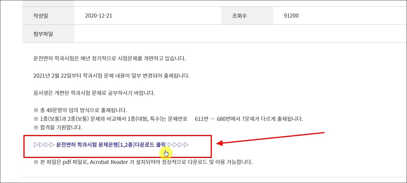 게시물을 열어보면 우리가 찾고 있던 운전면허 학과시험 문제은행 1종 및 2종을 다운로드 받을 수 있는 버튼이 있어요. 참고로 해당 파일은 pdf 문서로 되어 있어요. 그렇기 때문에 무료 pdf 뷰어를 설치해야 열람이 가능해요. 수마트라 pdf, Foxit pdf,. Acrobat reader 등 무료로 사용할 수 있는 pdf 뷰어가 많으니 참고해 주세요.
