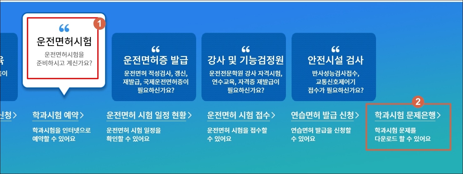 안전운전 통합민원 사이트에 접속하면 메인화면에 있는 "운전면허시험"을 클릭해 보세요. 그럼 필기시험 관련 서비스가 여러 가지 나타나는데요. 여기에서 "학과시험 문제은행"을 선택하면 돼요.
