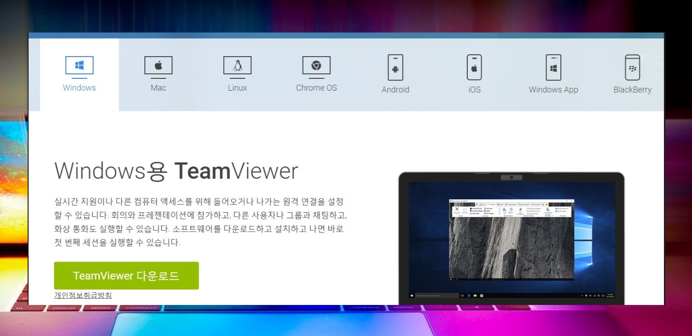 ▲ 이동한 화면에는 윈도우, 맥, 리눅스, 안드로이드, 블랙배리 등의 팀뷰어 설치파일이 준비되어 있습니다.