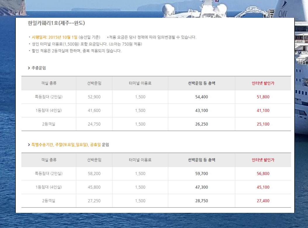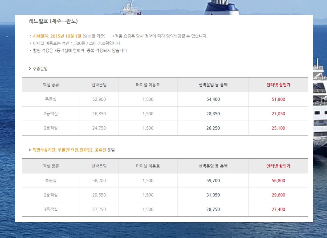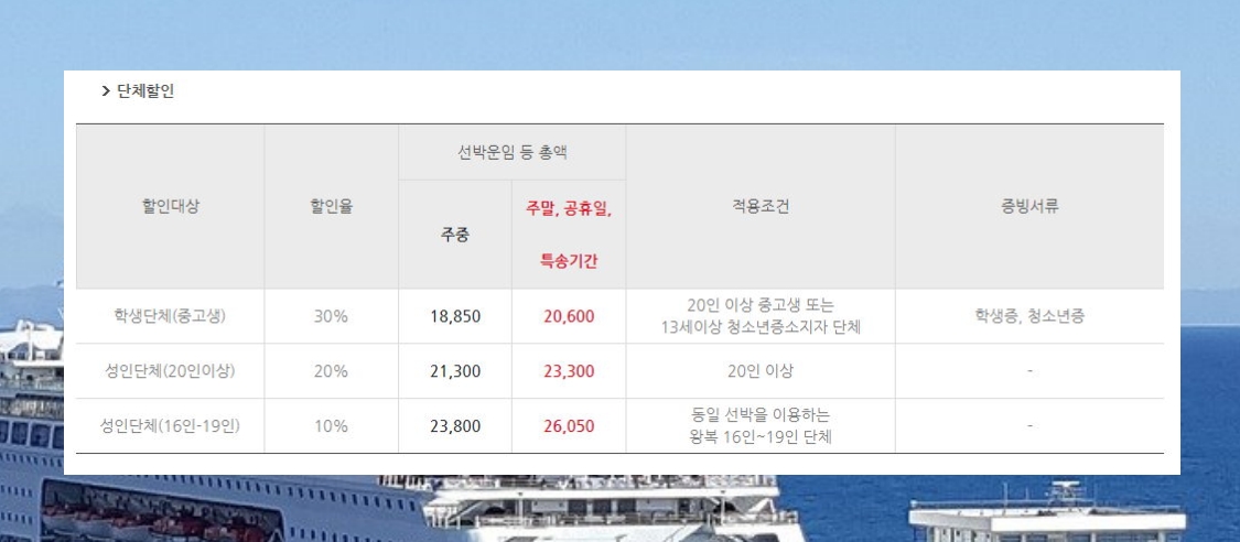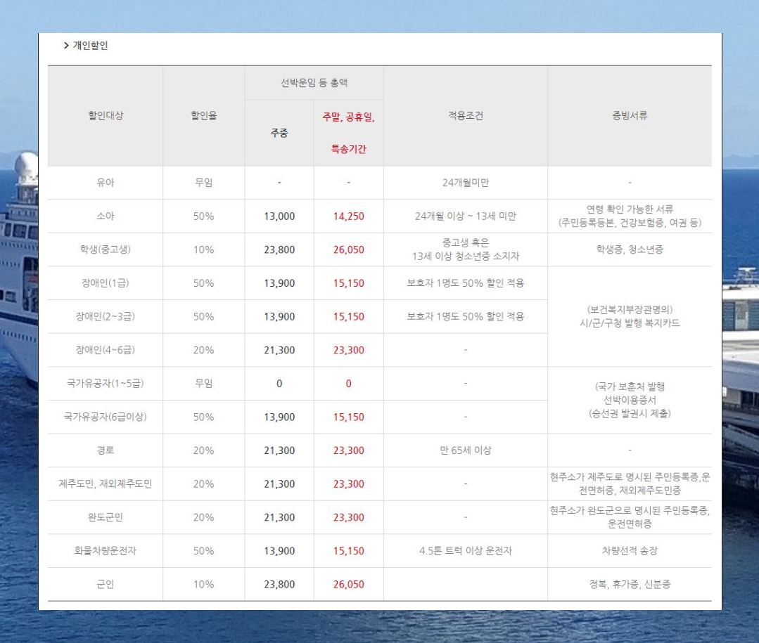 자격조건이 된다면 배편을 이용할 때에 할인을 받을 수 있습니다.
