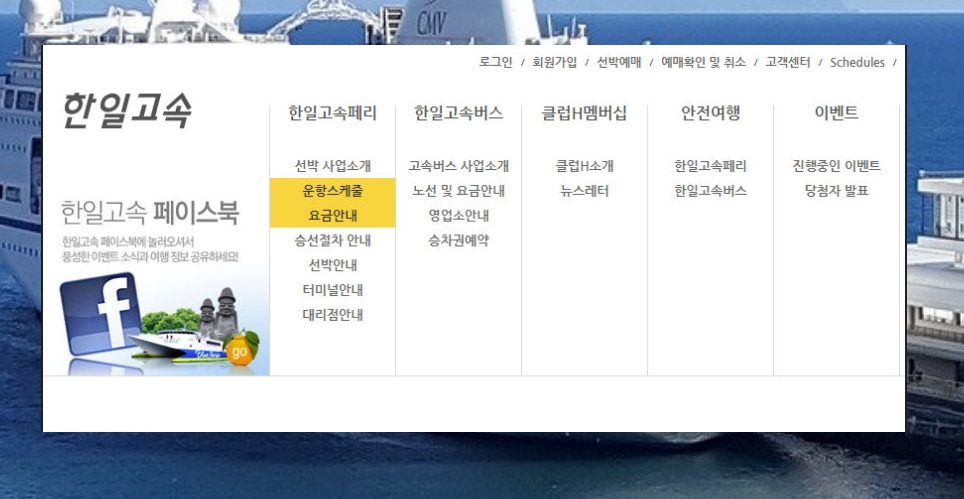 한일고속 홈페이지를 이용하는 것인데요. 메뉴에 있는 한일고속페리를 클릭한 후 운항스케줄을 클릭하면 정보를 확인할 수 있고요. 인터넷으로 선박 예약을 하실 수도 있습니다.