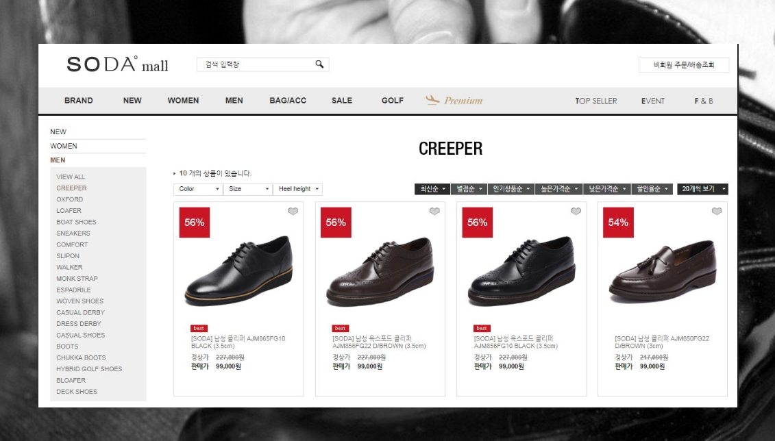 소다의 인터넷 쇼핑몰인 소다몰에 접속해보니 남자구두를 할인 판매하고 있네요. 제가 지금까지 많이 구매한 남자구두는 소다입니다. 할인도 많이 되고 많이 싸지는 않지만, 다른 브랜드에 비해서 저렴한 편이라서요. 디자인도 무난해서 제 마음에 쏙 듭니다.