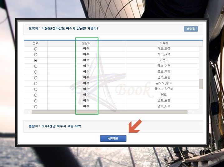 출발지와 도착지를 설정할 수 있는데요. 여수행 배편의 정보를 얻기 위해서는 출발지를 여수로 하시면 됩니다. 선택하셨다면 완료버튼을 클릭해주세요.