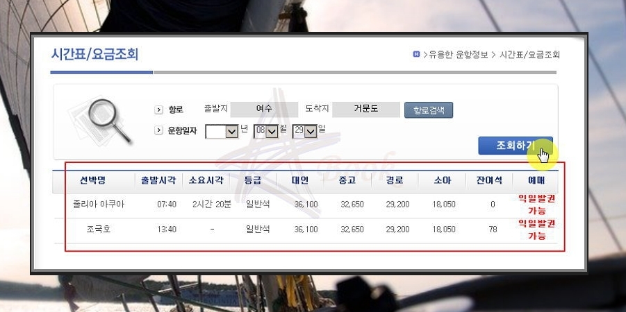 마지막으로 운항일자를 지정한 후 조회하기를 누르면 여수 여객선터미널에서 출발하는 선박의 일정, 가격, 소요시간, 잔여석을 확인하실 수 있습니다. 거문도로 가는 여객선은 줄리아 아쿠아와 조국호가 있네요.