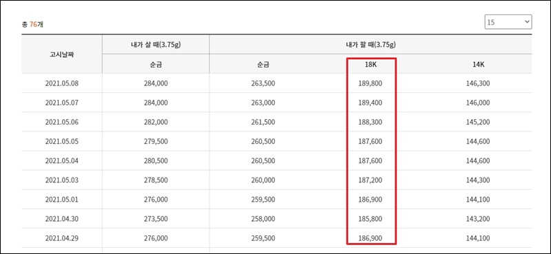 차트 아래를 보면 고시날짜에 따라 18K금을 내가 팔 때 1돈(3.75g) 가격이 되는지 확인이 가능해요. 이를 통해 서울 18K금 소매가 추이를 파악하는 데에 도움이 돼요.