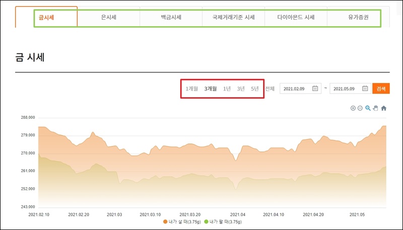 메뉴에서 "금시세조회" 버튼을 클릭해 보세요. 그럼 1개월, 3개월, 1년, 3년, 5년 기준으로 얼마나 시세가 변화하였는지 알 수 있어요. 순금이던 18K금 또는 14K금이던 오를 때 다같이 오르고, 내릴 때 다같이 내리기 때문에 서울 18K금 소매가의 시세 흐름을 파악할 때 해당 차트를 참고하는 것이 유효해요.