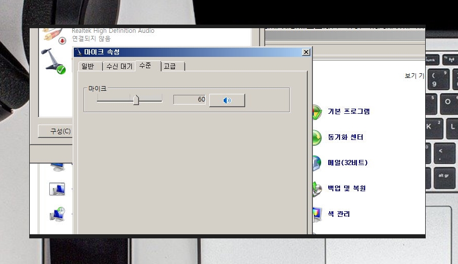 ▲ 마이크 속성창에서 수준탭을 클릭해 부세요.