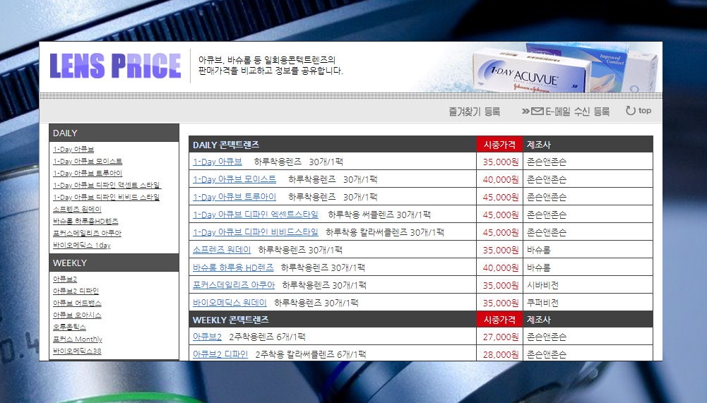 1회용 렌즈로 유명한 브랜드는 아큐브, 바슈롬 등이 있죠. 공식 홈페이지에 가보니 가격이 명시되어 있지 않은지 찾을 수 없더라고요. 그래서 콘텐트 렌즈 전용 가격비교 사이트를 찾았습니다. lensprice 라고 해서 주기적으로 업데이트 되기 때문에 최신 가격정보를 얻기에 좋아요.