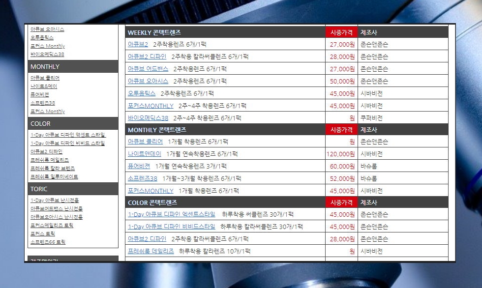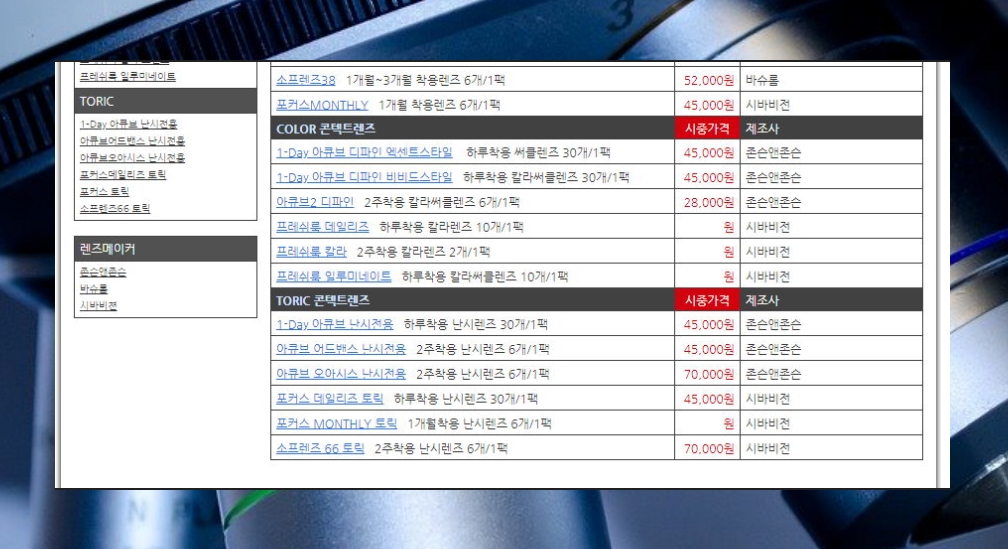그 외에 칼라 또는 난시 전용 컨텍트 렌즈의 가격도 확인할 수 있습니다. 다양한 제조사의 제품 가격이 나와 있기 때문에 비교하기 좋아요.