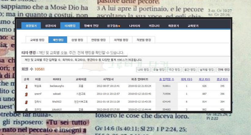 7) 좀 구체적인 이력을 보고 싶다면 타자랭킹을 클릭해보세요. 그럼 개인별, 교회별, 성별, 연령별, 지역별 등 다양한 분류로 본인의 랭킹을 확인할 수 있습니다.