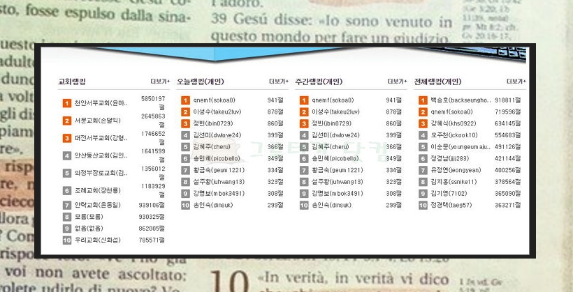 6) 열심히 하면 홈페이지 메인에 나오는 랭킹에 본인의 이름이나 교회를 올릴 수 있어요. 랭킹에 든다고 무조건 좋은 것은 아니지만, 기분이 좋아지고, 나름의 동기부여가 되기 때문에 성경타자 통독을 더욱 재미있게 하실 수 있습니다.