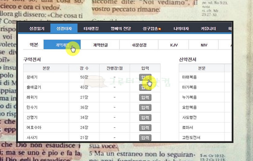 2) 사용하는 과정은 단순합니다. 로그인을 하고, 통독을 하고 싶은 서적을 선택한 후 표시되는 내용을 타이핑하시면 되는데요. 메뉴에 있는 '성경타자'를 눌러보세요.