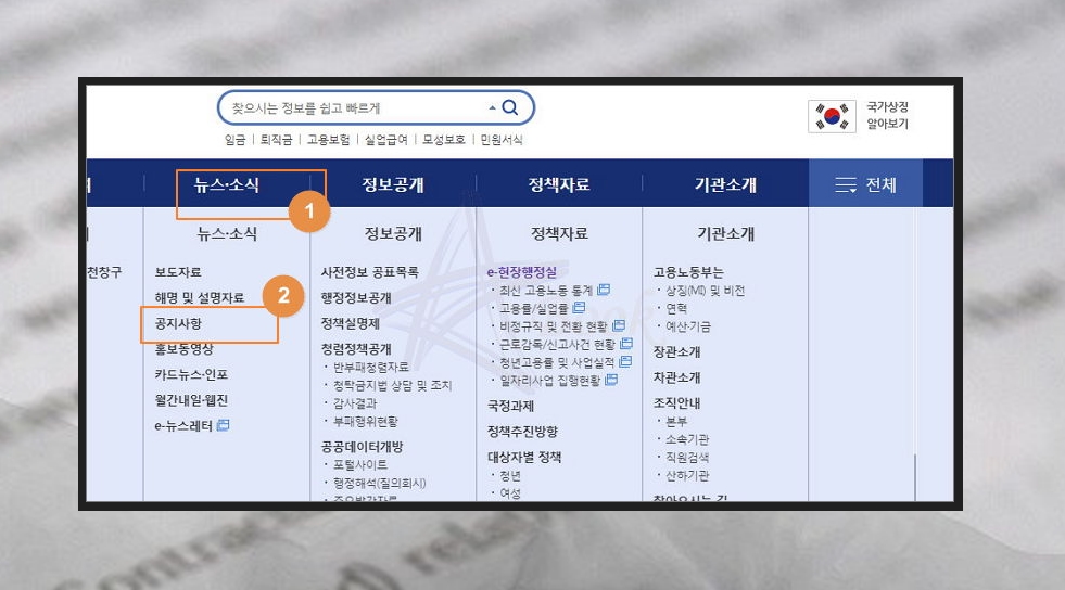 우리가 찾는 최신 버전의 양식 파일을 다운 받기 위해서는 메뉴에 있는 [뉴스와 소식]을 클릭해야 해요. 해당 카테고리에서 3번째에 위치한 공지사항을 클릭해 보세요.