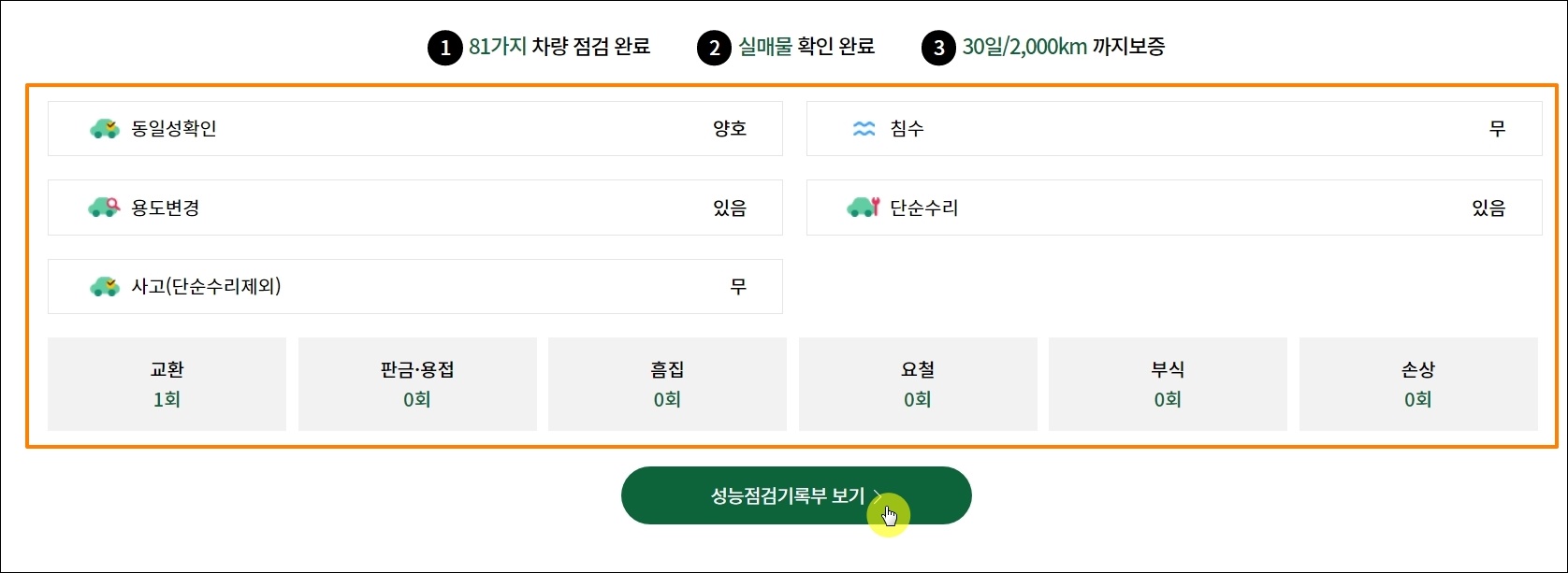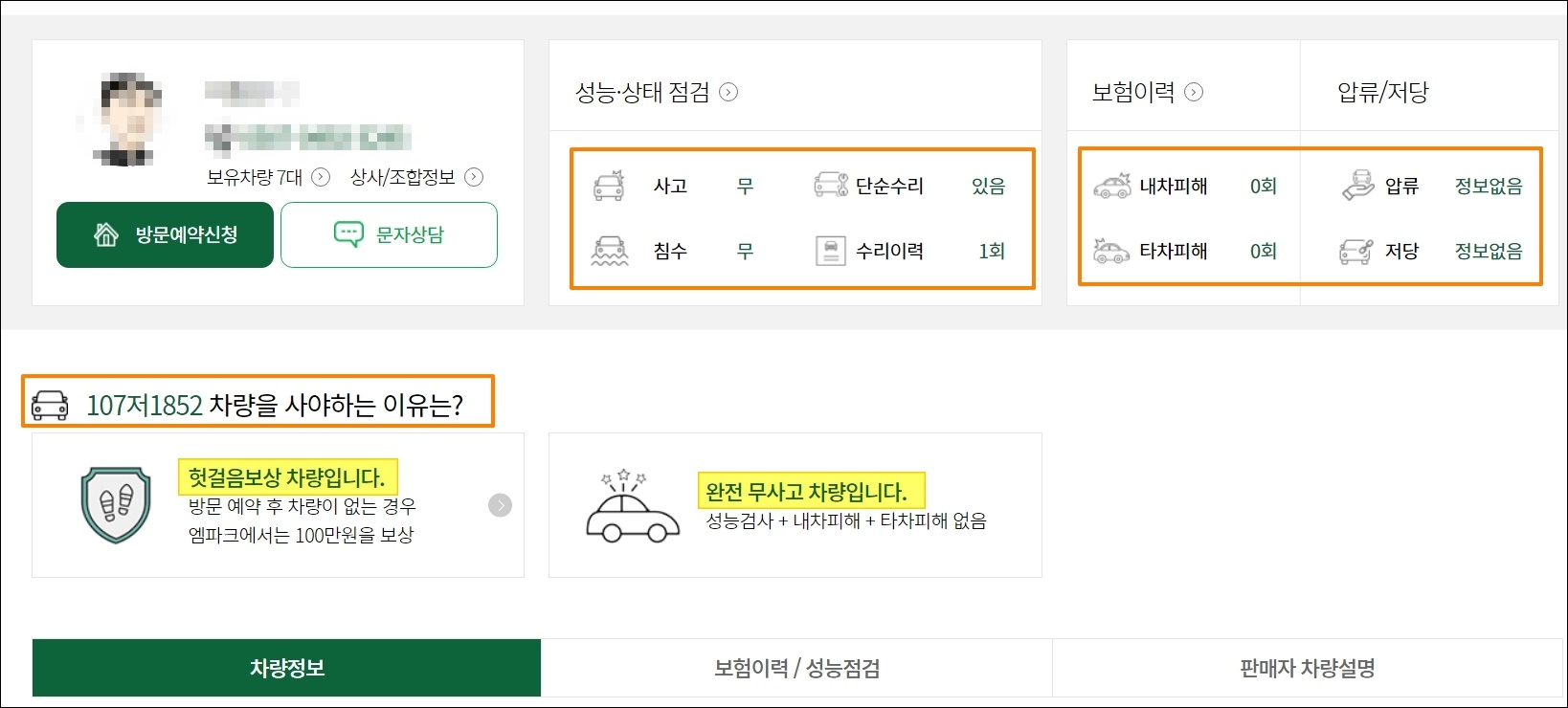 성능이나 상태 점검 결과나 해당 차량을 구매해야 하는 이유 등 중고자동차 구입에 도움이 되는 정보를 살펴볼 수 있습니다. 아무래도 중고로 구매하는 만큼 무사고 차량이 좋아요.