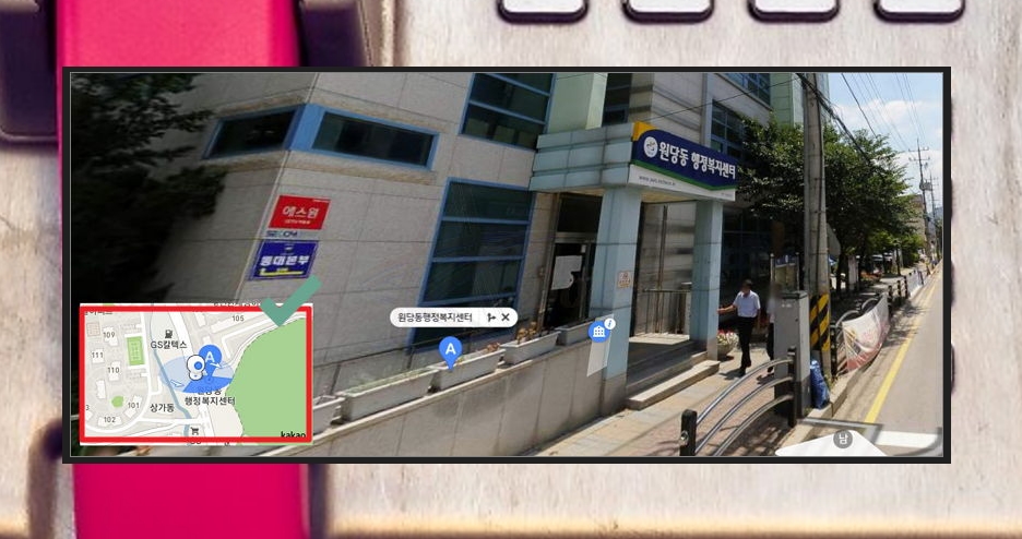 컴퓨터 캠 모양의 아이콘을 눌러보세요. 그럼 주변 풍경 확인이 가능해요. 이렇게 카카오맵을 이용하면 모르는 전화번호를 검색해서 로드뷰 확인까지 할 수 있어요. 낯선 장소에 가서 잘 모르는 위치를 찾을 때 유용해요.