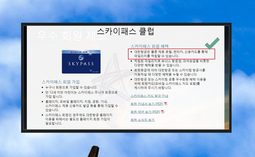 제휴 항공사를 이용했을 때에도 마일리지를 쌓을 수 있는 방법을 알려드릴게요. 탑승수속을 할 때 스카이패스 회원카드를 제시하면 돼요. 그럼 탑승일로부터 약 3일에서 14일 이후에 자동으로 적립이 될거에요.