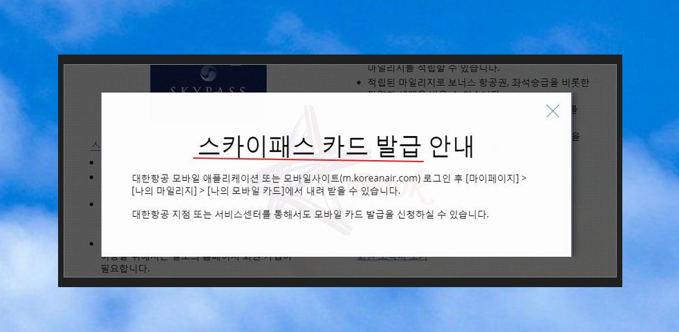 스카이패스 카드 발급 방법을 알려드릴게요. 대한항공 모바일 어플이나 모바일 사이트에 접속해서 로그인을 해주세요. 마이페이지에서 나의 마일리지로 들어가면 나의 모바일 카드 내려 받기를 하시면 돼요.