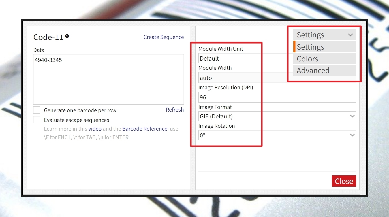 [톱니바퀴] 아이콘을 누르면 우리가 생성하는 바코드의 모습을 수정할 수 있습니다. 다운 받는 코드 이미지의 높이와 크기는 물론이고, 색상을 바꿀 수 있습니다. 다운 받는 이미지 파일의 포맷을 바꾸고 싶은 경우에는 Image Format 부분을 변경하면 됩니다.