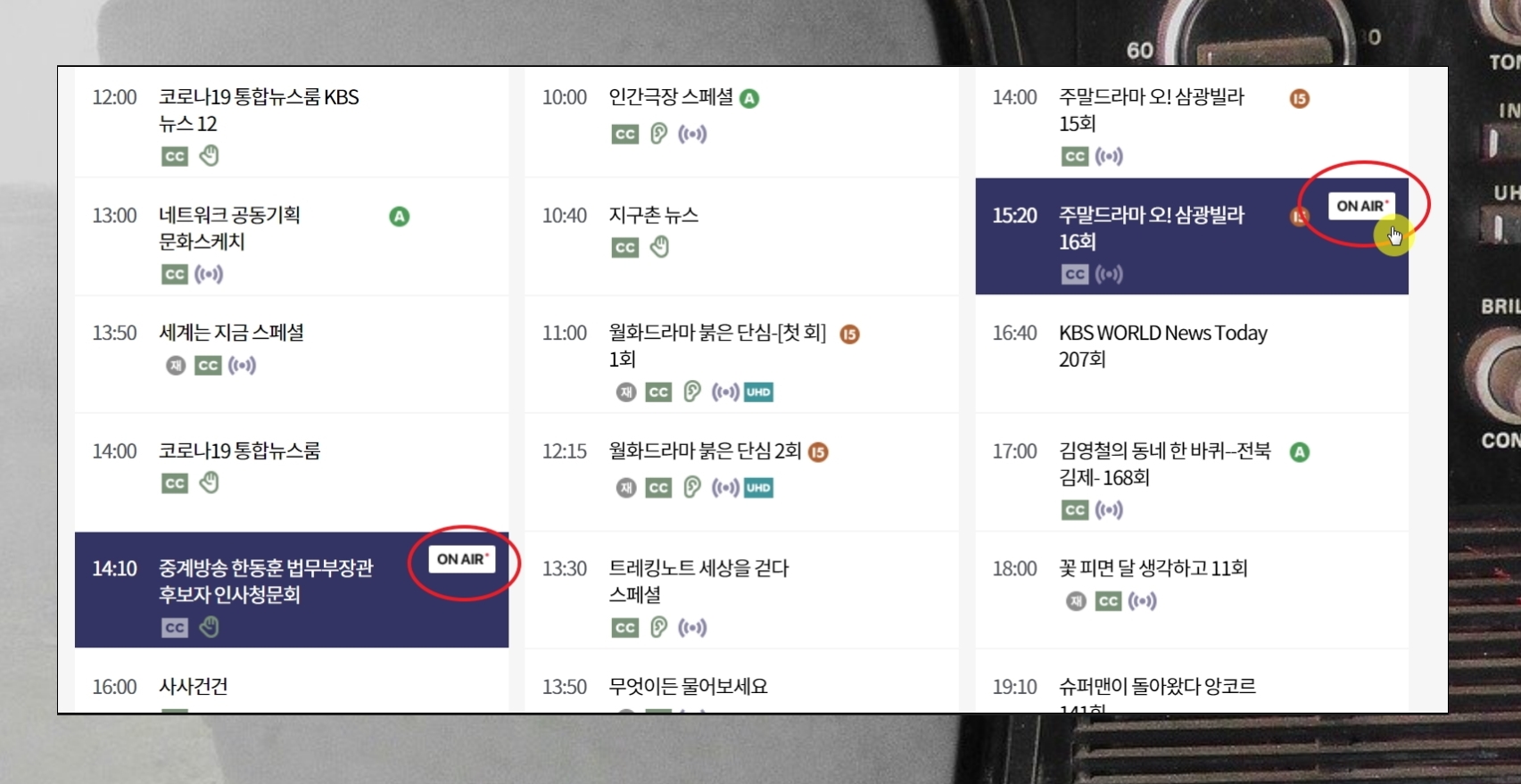 편성표를 보면 [ON AIR] 버튼이 나타나는 부분이 있습니다. 해당 버튼을 클릭하면 해당 채널에 대하여 바로 생방송 보기 서비스를 이용할 수 있습니다.