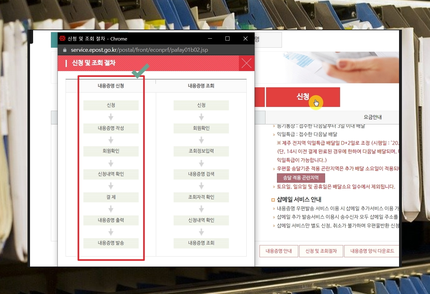 양식을 이용하여 문서를 작성하고 나면 상대에게 보내야 합니다. 인터넷 우체국 사이트에서 [신청] 버튼을 누르면 쉽게 내용증명을 보내는 것이 가능합니다. 신청 및 조회하는 절차는 다음과 같습니다.