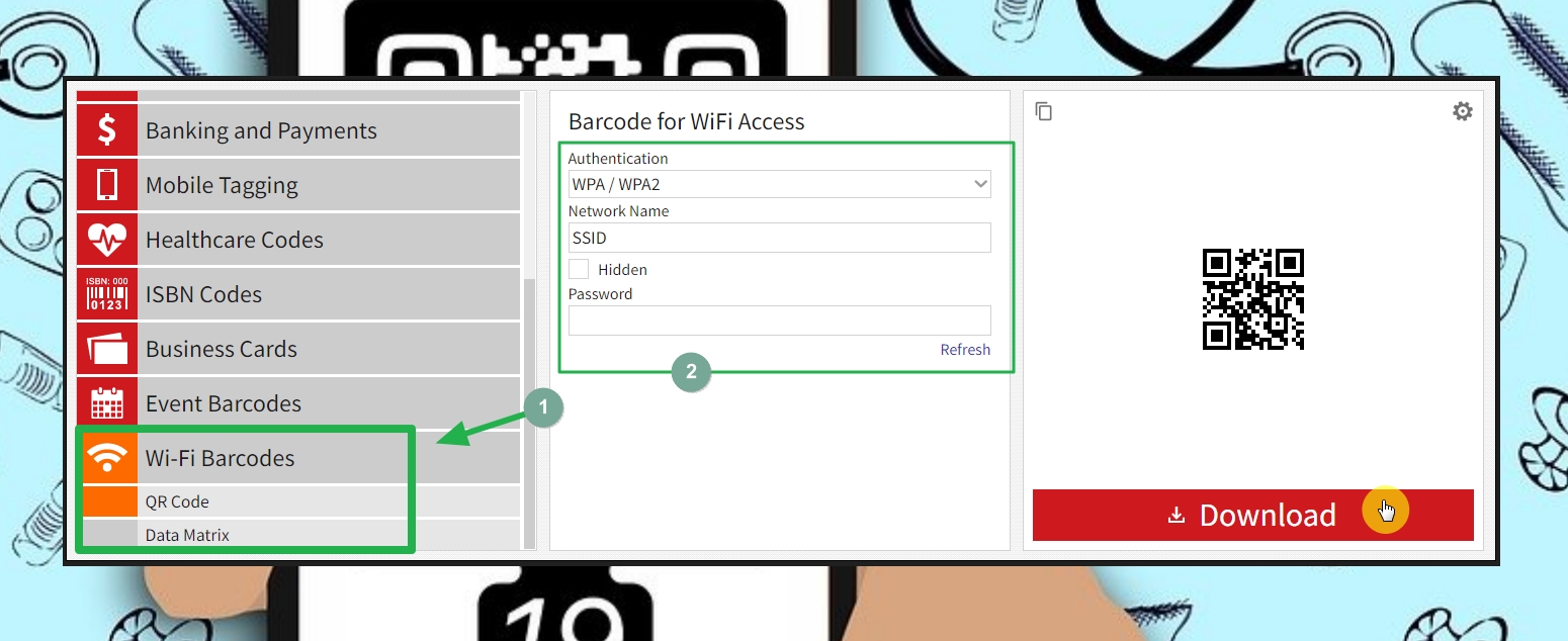 제가 앞서 언급한 바와 같이 이곳에서는 여러 가지 종류가 있습니다. 가게를 운영하신다면 공유기 암호를 손님에게 알려드리기 위한 큐알코드가 필요할 텐데요. 'wi-fi barcodes'를 선택하면 쉽게 제작할 수 있어요. 인증서 종류, 네트워크 이름, 비밀번호를 차례대로 입력한 후, 다운로드 버튼을 누르면 이미지 파일로 내려 받을 수 있습니다.