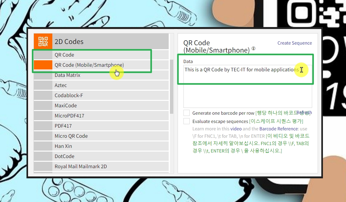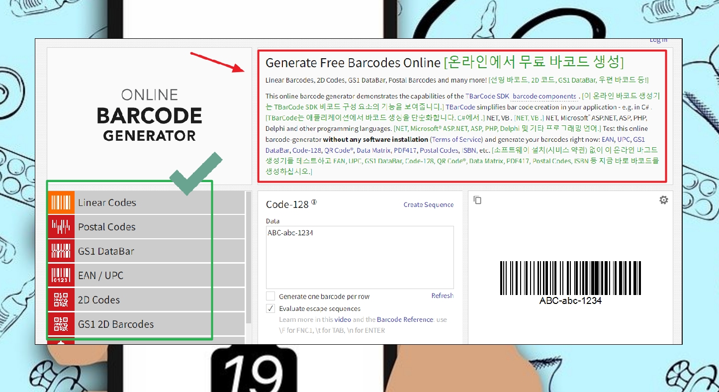 온라인 barcord 제너레이터 사이트에서는 큐알코드는 물론이고, 여러 가지 무수히 많은 바코드 만들기 가능합니다. 별다른 프로그램을 설치하지 않고, 바로 온라인 상에서 우리가 원하는 결과를 얻을 수 있어서 정말 좋아요. 영어로 되어 있는 사이트이지만, 사용 방법이 매우 간단하기 때문에 어려움은 없습니다. 혹시 몰라 영어로 조금 번역해 놓았으니 참고해 주세요.