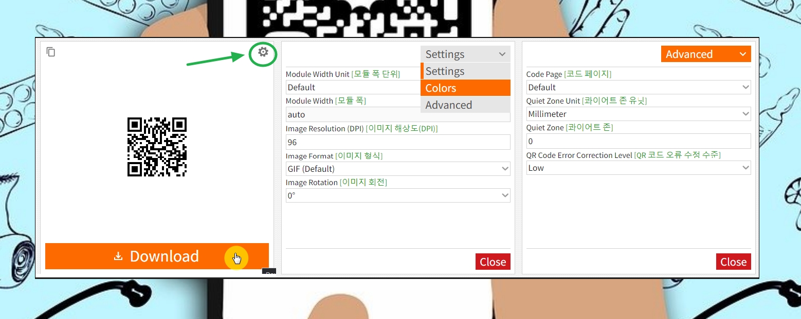 바로 다운로드 버튼을 누러보세요. 이미지 파일로 된 큐알코드를 다운로드 받을 수 있어요. 그 전에 우측 상단에 있는 톱니바퀴 모양을 클릭해 보세요. 여러 가지 설정을 할 수 있는데요. 우리가 다운 받을 결과물의 폭, 해상도, 색상, 파일 형식에 대한 변경이나 회전을 할 수 있습니다.