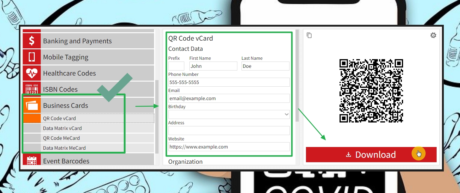 다음은 제가 주로 사용하는 큐알코드 생성 사이트 입니다. 이곳을 통해 다양한 버전을 만들어 볼 수 있어요. 텍스트나 공유기 비밀번호, 사이트 주소는 기본이고요. 다음과 같이 명함에 들어가는 모든 정보를 넣는 것도 가능합니다. 내용을 입력하고, 다운로드 버튼만 누르면 생성 완료 입니다.