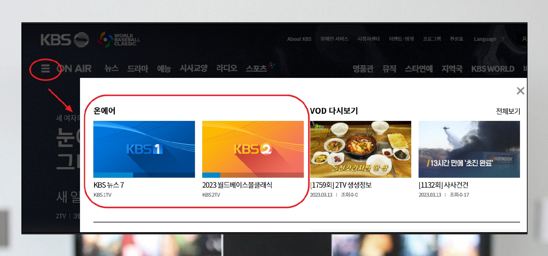 사이트에 접속하면 여러 가지 메뉴가 나타나는데요. 이 중에서 가장 좌측에 있는 전체 메뉴 버튼을 클릭해 주세요. 그럼 온에어와 VOD 다시보기 목록이 나타납니다. 이 중에서 지상파에 해당하는 KBS1 TV와 KBS2 TV를 선택할 수 있어요. 현재 2023년 월드베이스볼 클래식 프로그램이 진행되고 있네요.