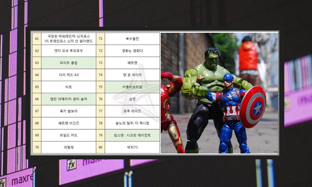 오늘은 액션영화 순위 100 중에서 개인적으로 좋아하는 작품들을 추천해 드렸는데요. 사람마다 취향이 다르기 때문에 절대적인 평가라고는 할 수 없습니다. 살짝 참고만 해주세요.