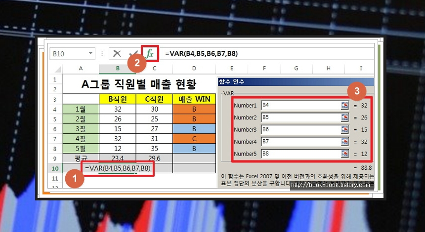▲ 분산값을 넣고 싶은 부분에 =VAR( 까지만 입력하시고 Fx를 눌러주세요.