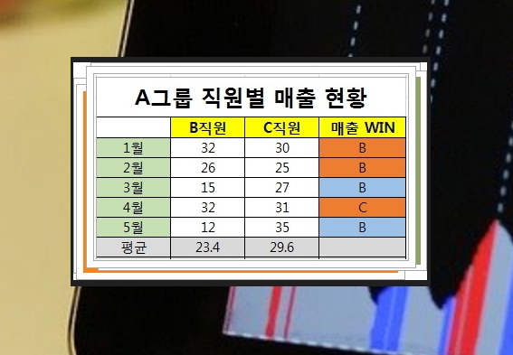 ▲ 직원별 매출 실적 현황입니다. 딱 보면 B가 어떤 사람인지 보이시죠?