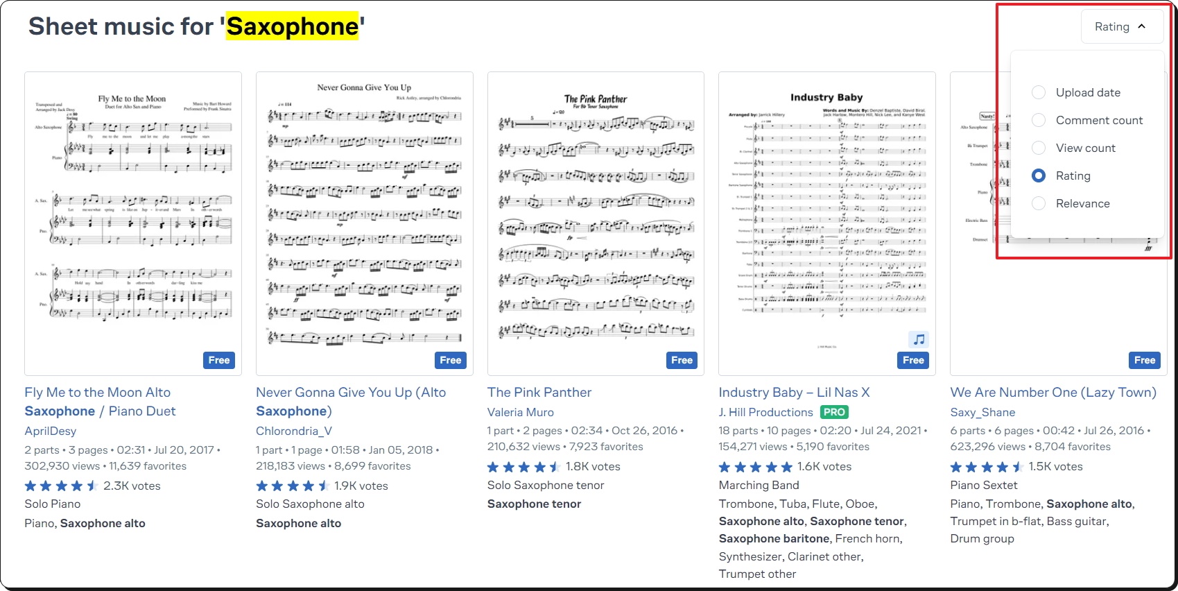 꽤 많은 색소폰 악보가 검색이 되었습니다. 자료에 보면 "Free" 표시가 되어 있는 것처럼 무료로 이용할 수 있는 것들인데요. 생각보다 많이 있습니다. 그리고 사이트 화면에서 우측 상단에 보면 정렬 버튼이 있는데요. 여기를 누르면 최신순, 댓글 많은 순, 조회순, 평점순, 관련순으로 정렬이 가능해요.