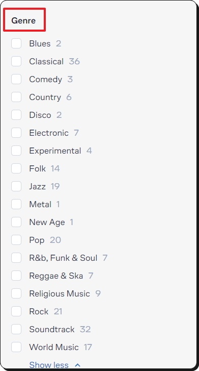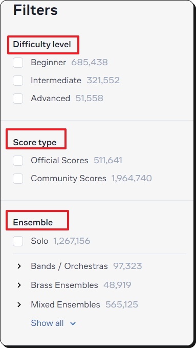 악기 외에도 장르나 난이도, Score type, Ensemble 등의 조건을 설정할 수 있습니다.