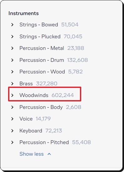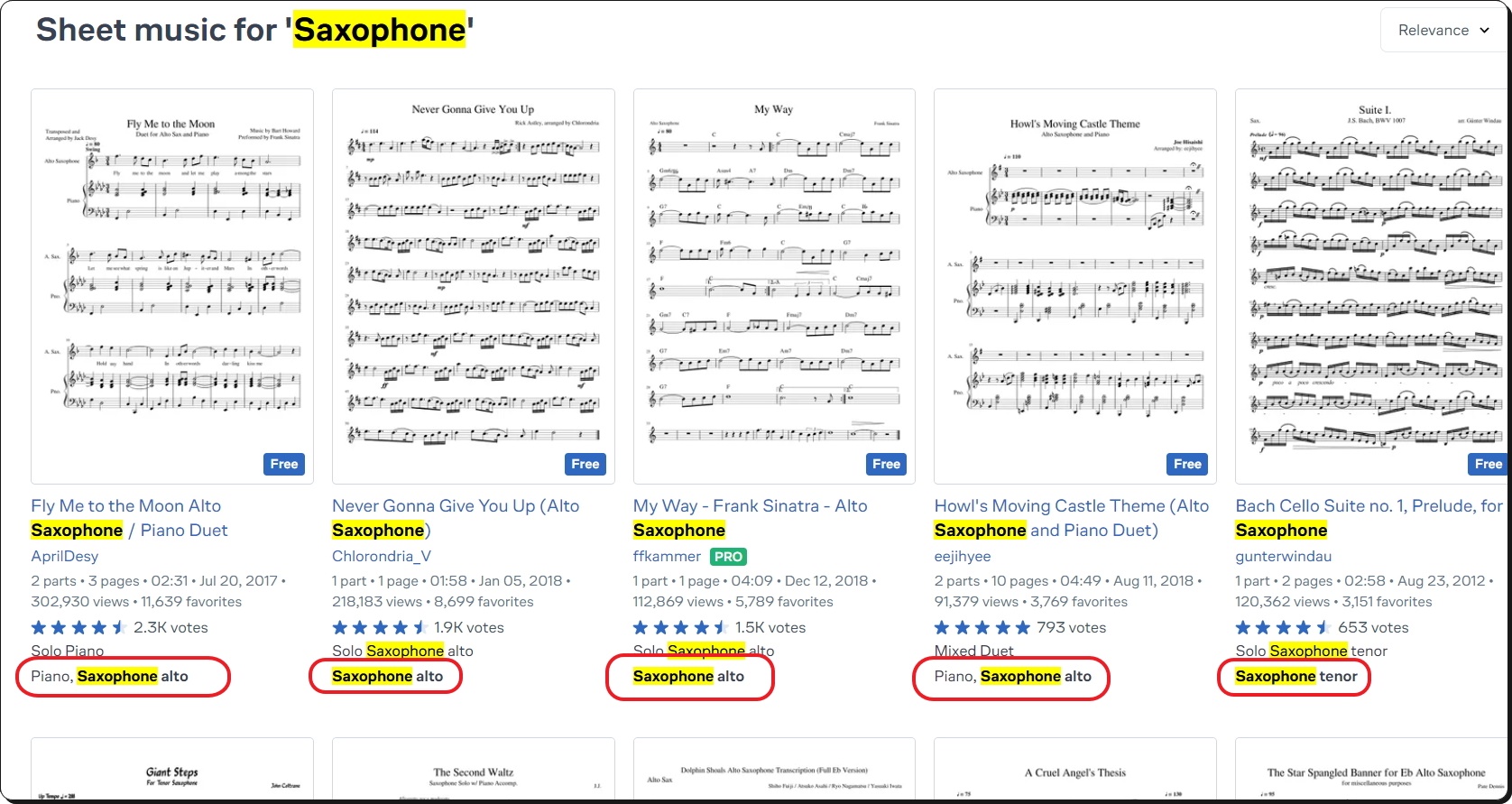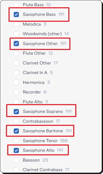 검색이 되는 악보의 수가 수십만가지나 되기 때문에 좌측에 있는 필터 기능을 이용하여 원하는 자료만 리스트에 나타나게 할 수 있습니다. 일단 악기(Instruments)를 색소폰만 선택해야 하는데요. WoodWinds 카테고리에 있는 Sexophone 종류를 선택하면 됩니다. 앞서 언급한 5가지 종류에 해당하는 Bass, Soprano, Baritone, Tenor, Alto가 있네요.
