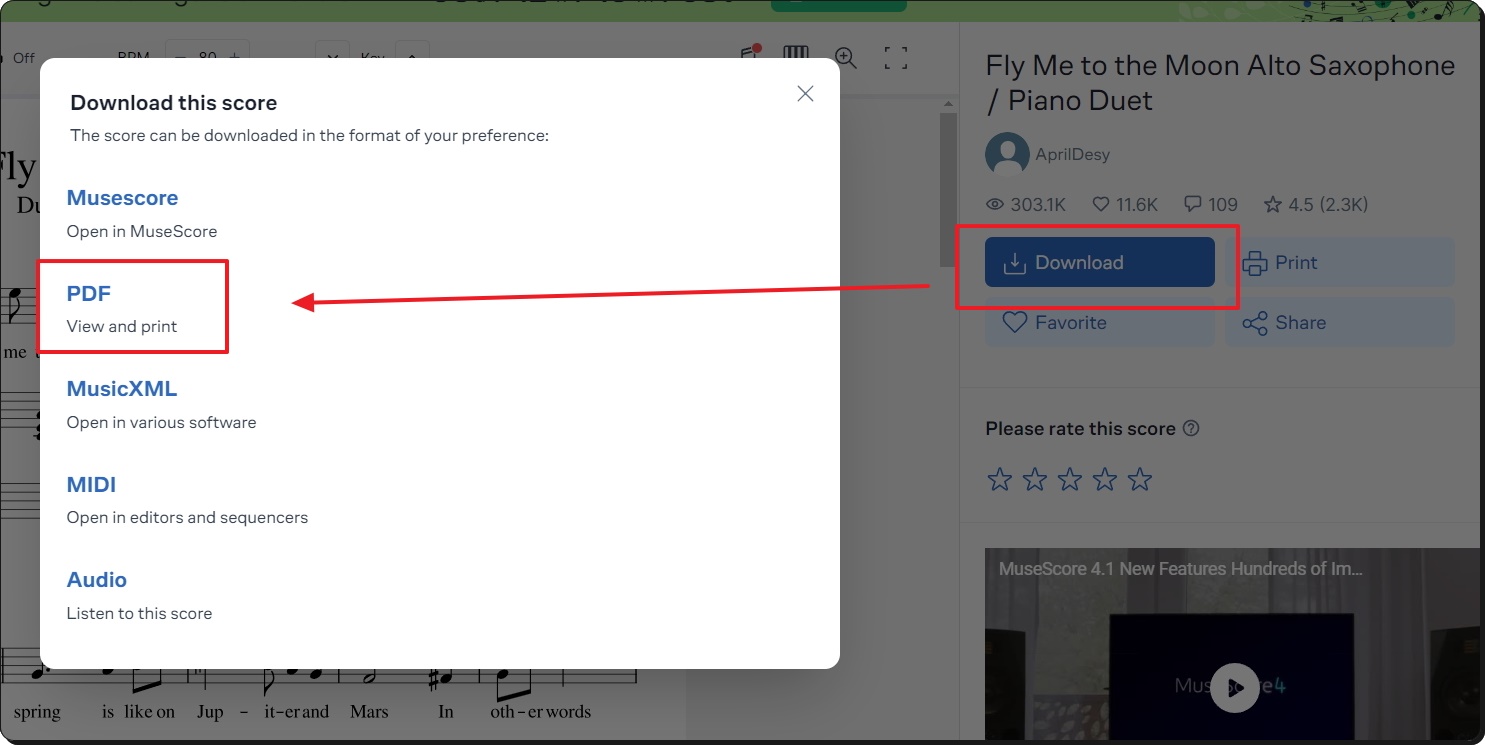 악보를 다운로드 받는 것도 가능한데요. 사이트 화면 오른편에 보면 Download 메뉴가 있습니다. 해당 메뉴를 누르면 우리가 찾은 곡에 대하여 악보나 연주 음악 파일을 다운로드 받을 수 있어요.