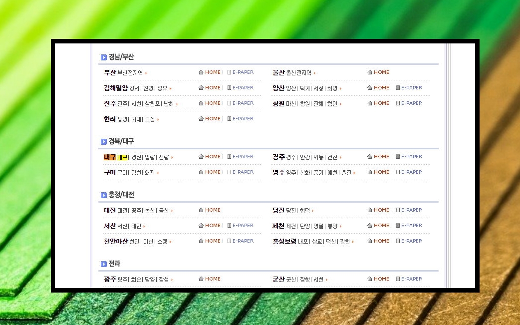 이동한 페이지에서 지역을 선택하시면 되는데요. 경북/대구 카테고리 아래에 대구가 있습니다. 그 옆에 "E-PAPER" 표시가 보이시나요? 이 표시를 마우스로 클릭해 주세요. 대구에는 경산, 압량, 진량 지역의 정보까지 포함되어 있으니 참고해 주세요.