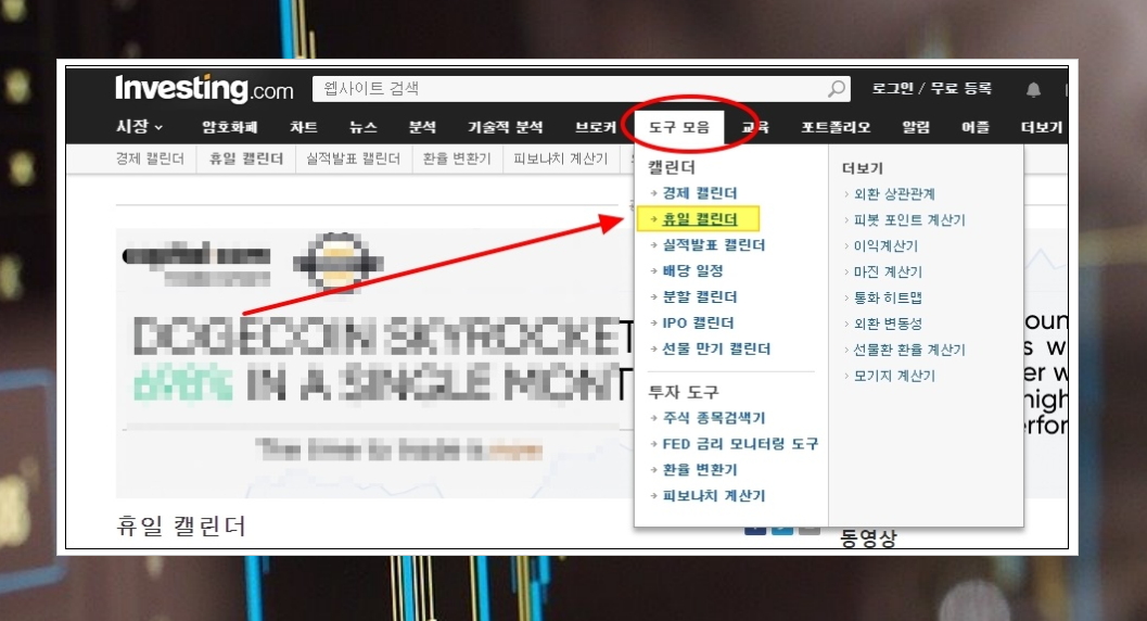 인베스팅의 경우 회원가입을 하지 않아도 대부분의 정보와 서비스를 이용할 수 있게 되어 있습니다. 미국의 휴장 정보를 알고 싶다면 메뉴에서 "도구 모음"을 클릭한 후 휴일 캘린더를 선택하면 됩니다. 배당, 실적발표, IPO, 선물 만기에 관련된 캘린더도 제공하고 있습니다.
