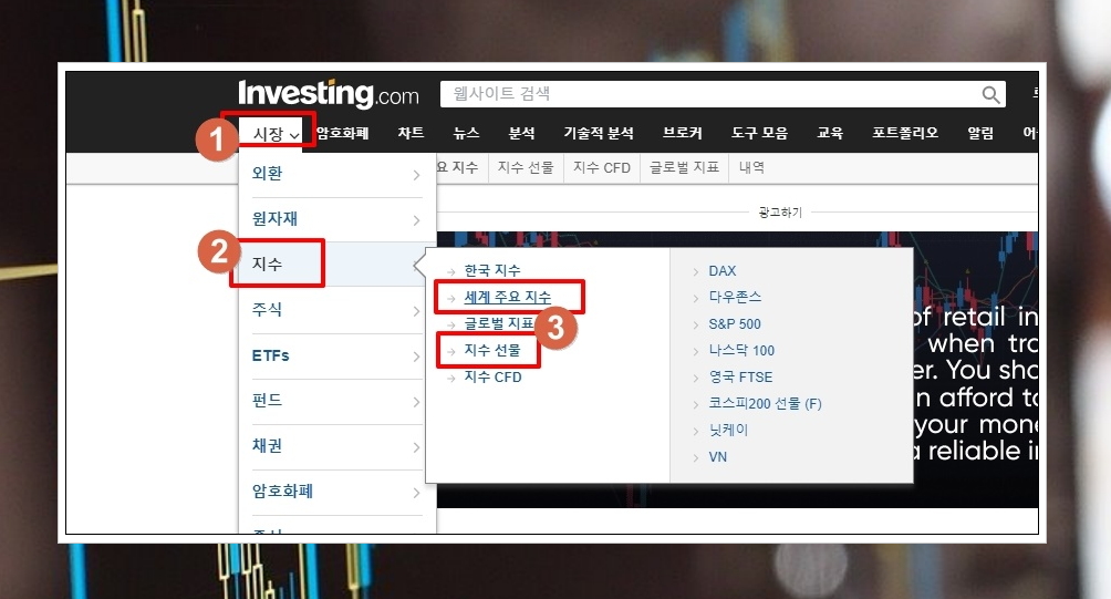 증시에 대한 정보를 얻고 싶을 때에는 메뉴에서 "시장", "지수"를 클릭합니다. 그럼 여러 종류의 하위 메뉴가 나타나는데, 여기에서 미국의 경우 "세계 주요 지수" 또는 "지수 선물"을 선택하면 됩니다.