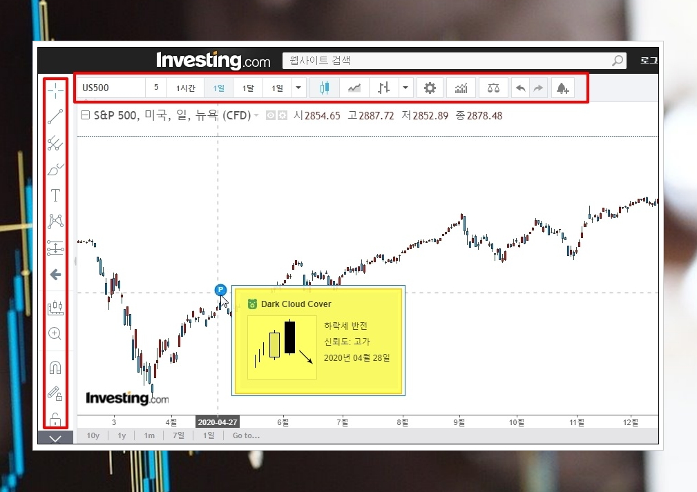 기술 차트를 사용하면 오늘 미국 증시에 대한 분석을 심도 있게 할 수 있습니다. 그래프 상에 보면 동그란 표시가 나오는데, 여기에 마우스를 대면 캔들 분석이나 뉴스 정보 등을 확인할 수 있습니다.