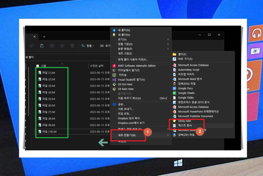 5. 지금까지 윈도우10 운영체제에서 하나의 파일에 대한 확장자를 변경하는 방법을 알려드렸는데요. 이번에는 윈도우10에서 한 번의 작업으로 여러 개를 일괄적으로 확장자 바꾸는 방법을 알려드리겠습니다. 이 작업을 진행하기 위해 "txt" 파일을 10개 만들었는데요. 해당 폴더의 빈 공간에 마우스 우클릭 후 "새로 만들기"와 "텍스트 문서"를 차례대로 클릭해 주세요.