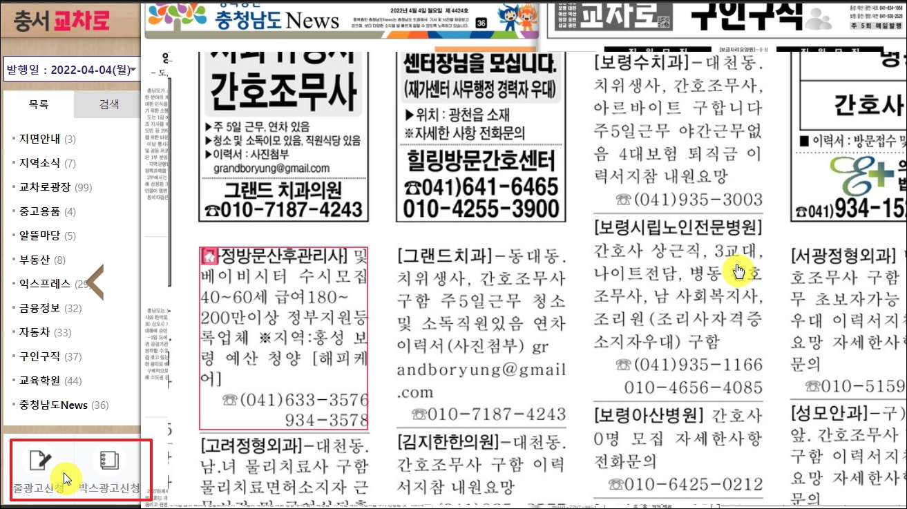 ▼저는 구인구직을 선택해 보았습니다. 홍성 교차로 신문 이북의 지면을 보면 글씨가 작아서 보기 어려울 수 있습니다. 이런 경우 지면을 마우스로 클릭하면 내용이 확대가 됩니다. 줄광고나 박스광고를 신청할 수 있는 버튼도 마련되어 있으니 필요할 때 사용해 보시길 바랍니다.